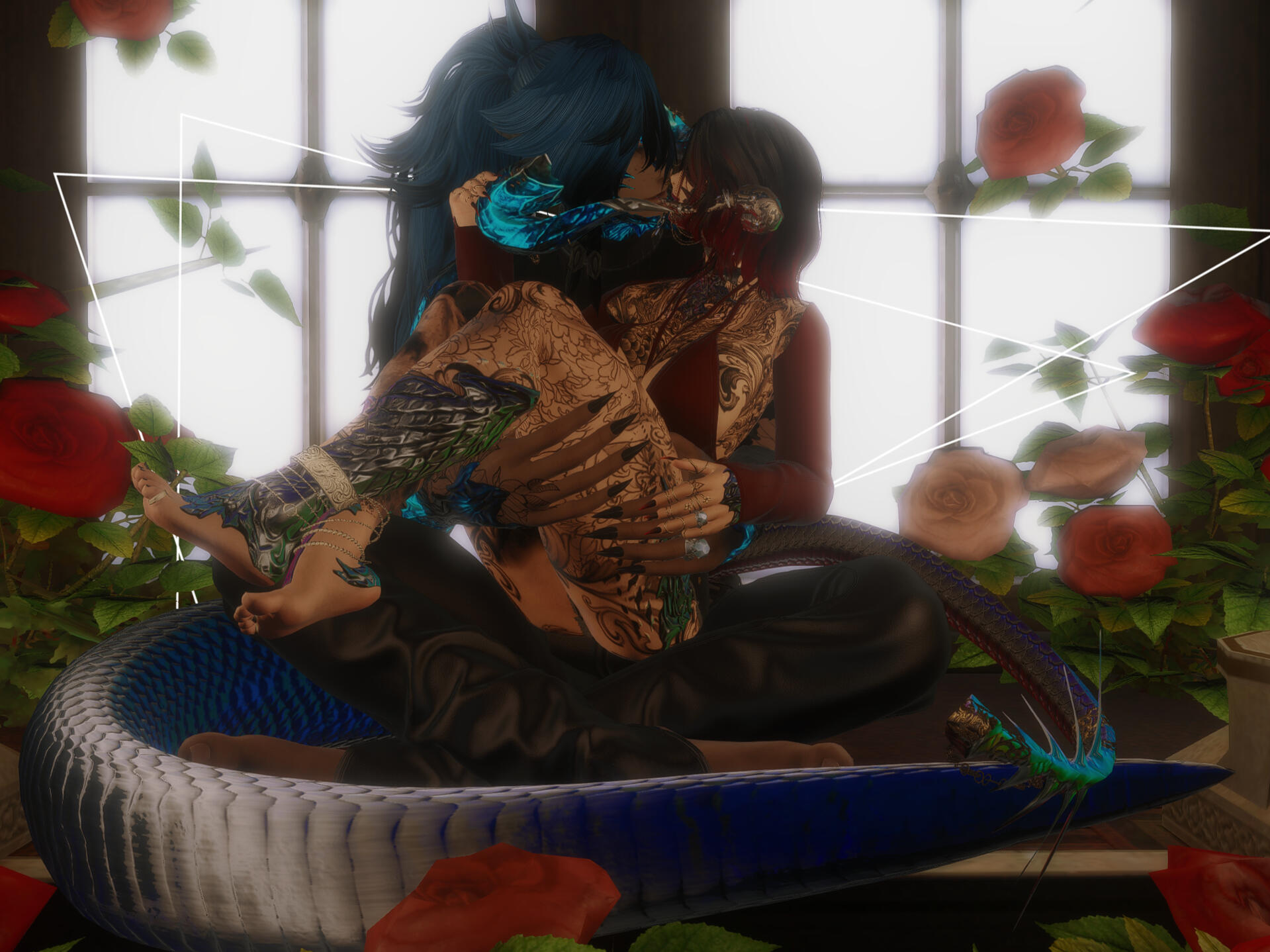 Her Starlight | Her Melody on the Wind. An unexpected surprise and a connection that she is thankful to have. Passing coworkers turned into long conversations to teasing each other's company. Their first time together was explosive, snarky comments leading to Tatsu with two scars from their time together. A small line that seem to match the distance between the spines on the end of her tail, and the scarring of her teeth in his neck from her excitement.After a small talk on the beaches of Costa Del Sol, and her opening her arms and her heart to comforting a seemingly lost Tatsu; they seem like they've been together for years when standing next to each other. They move about comfortably, like they tend to weave a dance, he adding melodies to her day when he is around.