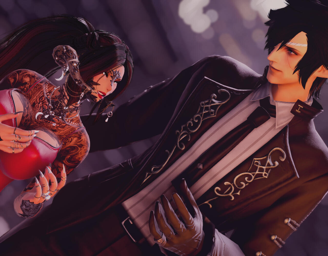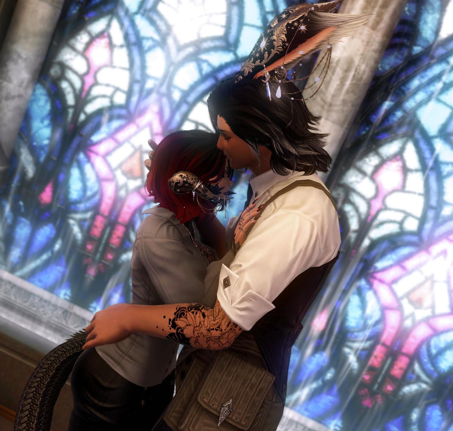Her Dragon | Her Ishgardian. One of Kenji's longest standing partners before she met her current husband and someone she trusts entirely. He is like feeling the fresh snow crunching under your boot first thing on a cold morning, bundled up in a warm coat with a cup of coffee to sip to her. He is comfort. He is Home.One could swear these two were married when they are in a room together and she is within arms reach of him, the way she softens when she looks at him and he takes her attention off the room.